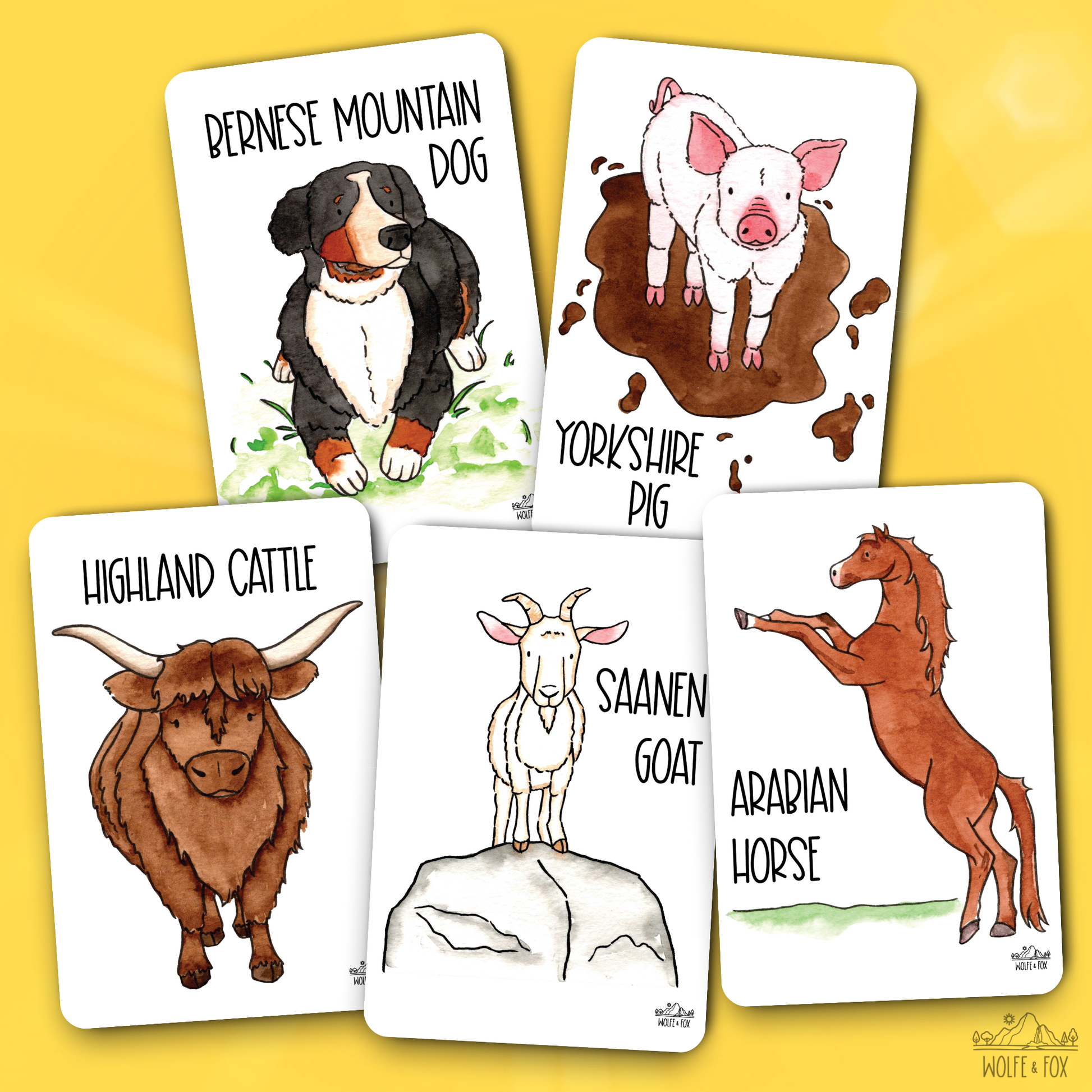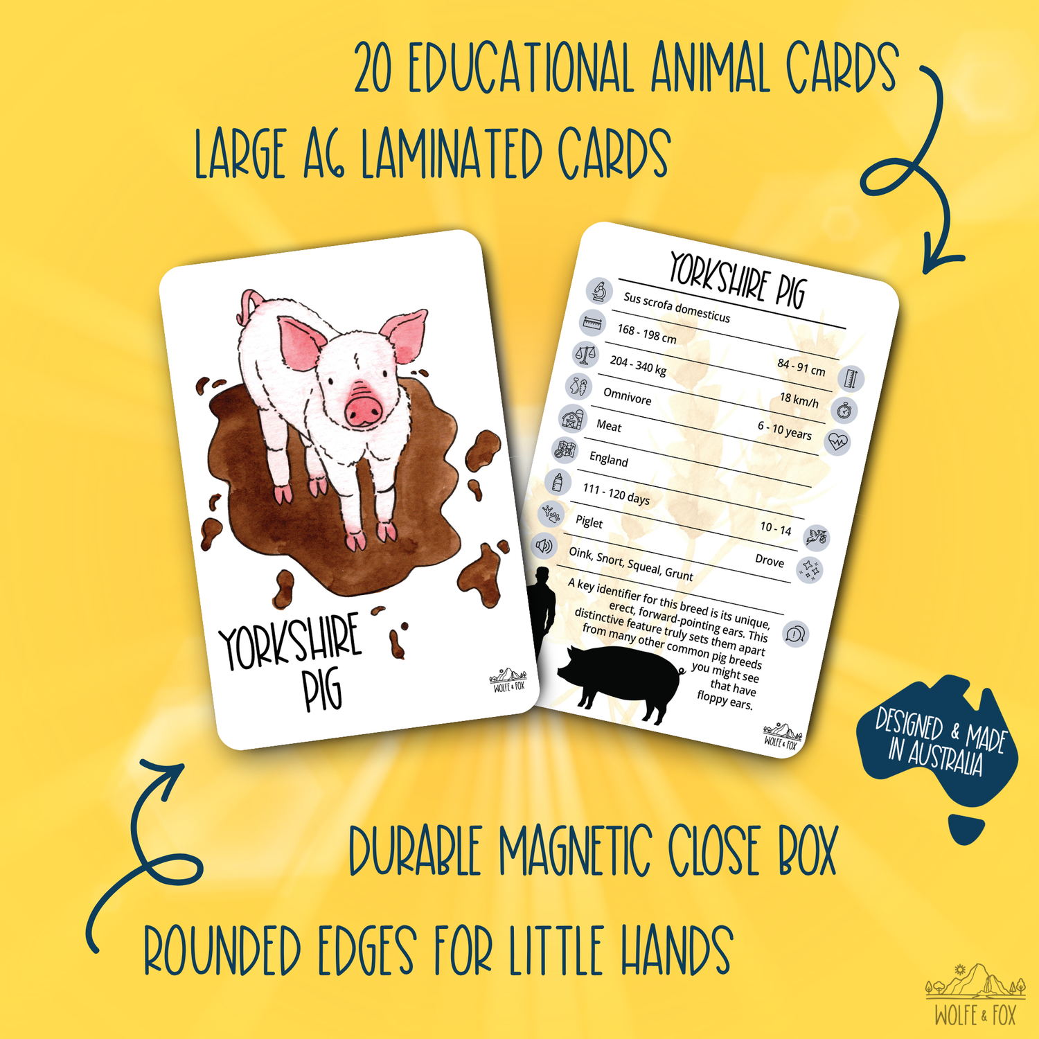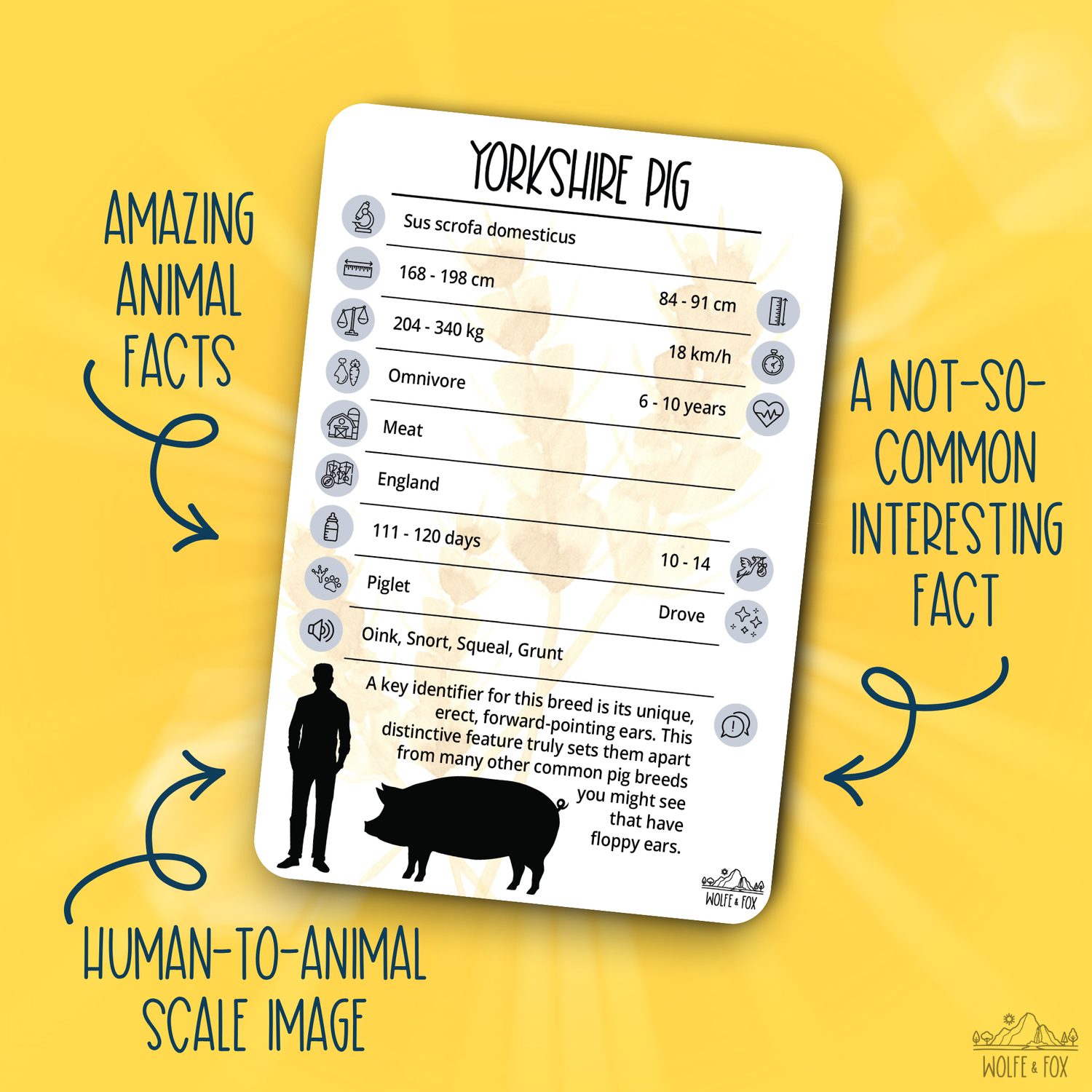 Get ready to unearth some astonishing facts! The back of every card is packed with information, featuring 15 accurate, engaging facts about each animal. We love sparking discovery by including "not-so-common interesting facts," providing details on conservation and biology - like how the Yorkshire pig can be identified by its unique, forward-pointing ears. Kids and parents especially love the human-to-animal scale image, which helps young minds truly visualise the massive difference between a small duck and a mighty cow. These are the perfect resource for school projects and connecting with the incredible creatures that share our farms!