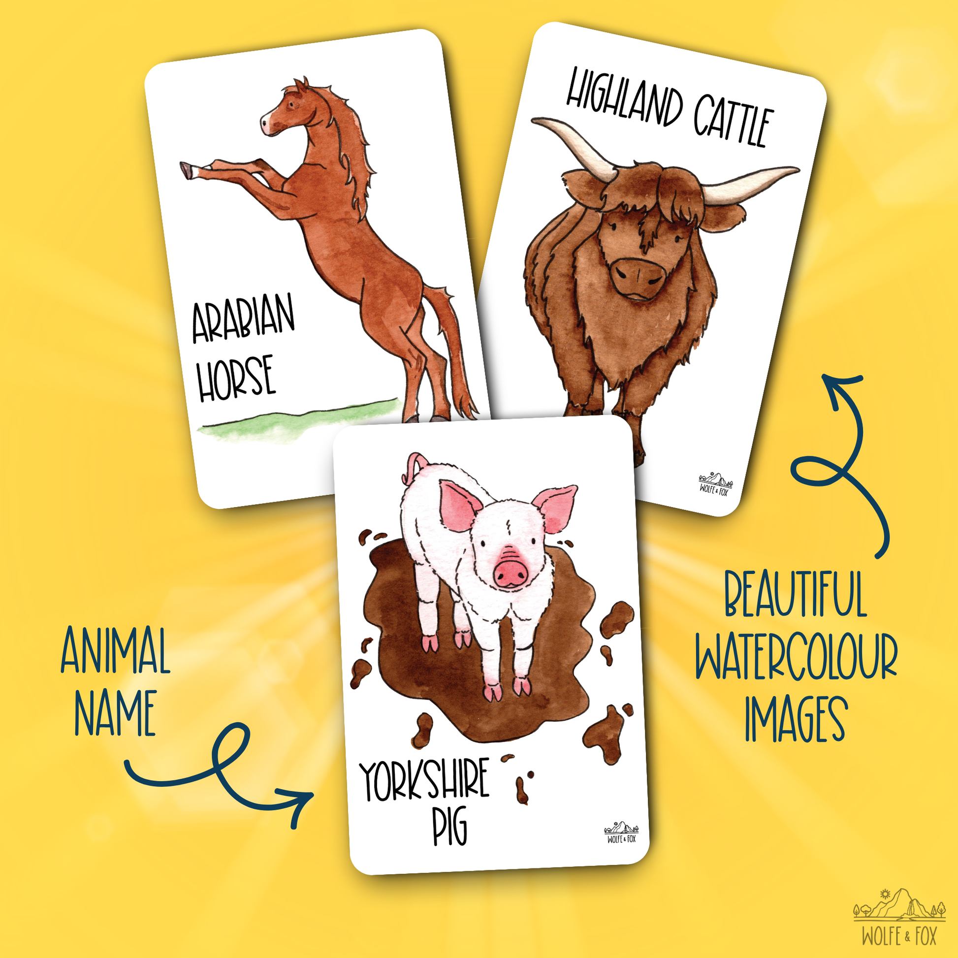 Open up the Barnyard Buddies set and you'll immediately see the difference. Each of the 20 classic barnyard animals—from the mighty Arabian Horse to the fluffy Highland Cattle—is captured in a unique, hand-drawn watercolour image. This gentle artistic style is perfect for young eyes and beautiful enough to be used as vibrant décor in a nursery or classroom. As a 100% Australian-designed, owned and made product, you know the quality is exceptional. These large A6 cards are tactile, becoming an essential tool for imaginative play alongside your child's toy barn or small world farm scene.