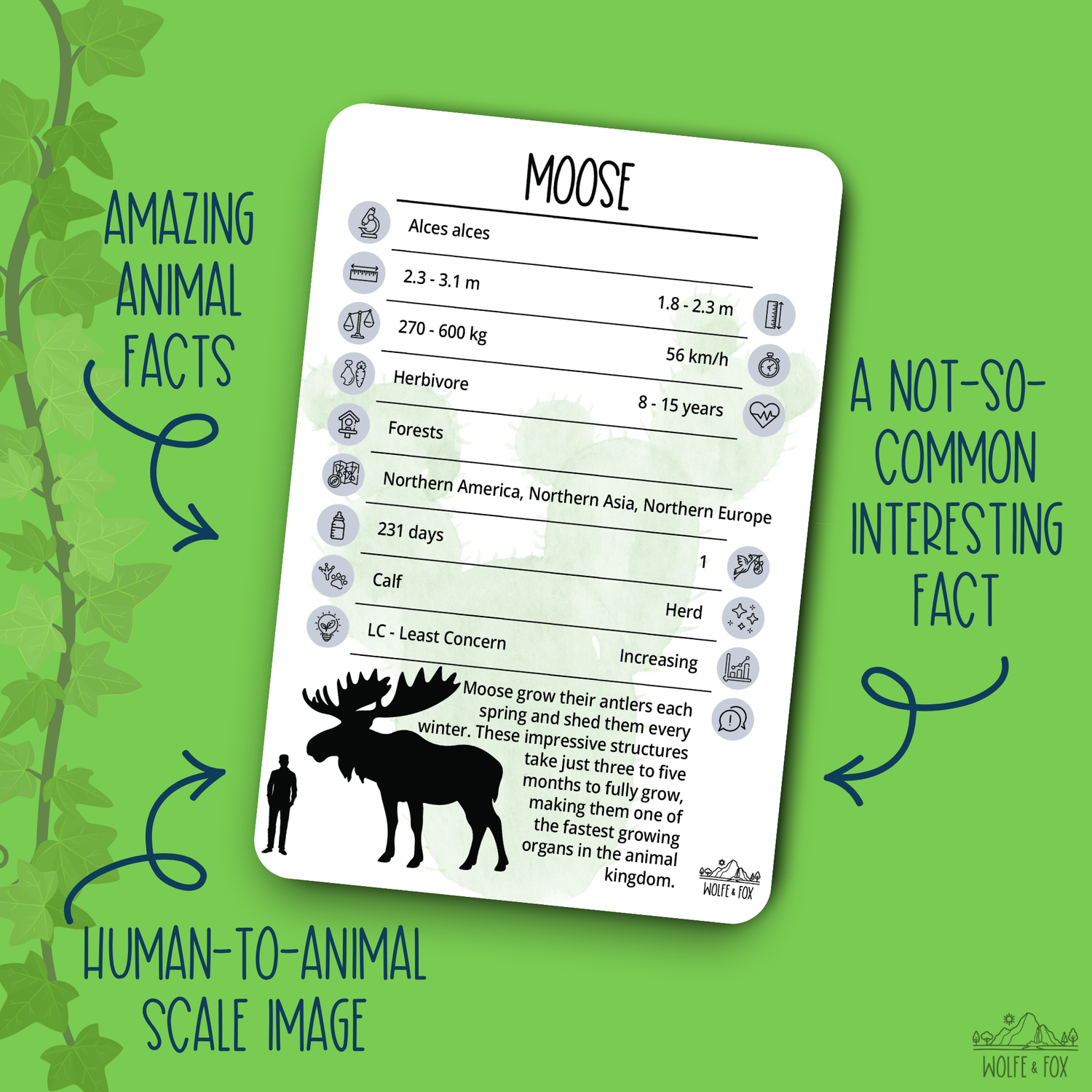 Get ready to unearth some astonishing facts! The back of every card is packed with information, featuring 16 accurate, engaging facts about each animal. We love sparking discovery by including "not-so-common interesting facts," providing details on conservation and biology, like how the moose grows the fastest-growing organs in the animal kingdom (its antlers). Kids and parents especially love the unique human-to-animal scale image, which helps young minds truly visualise the massive difference between a tiny marsupial and a massive white rhinoceros. These are the perfect resource for school projects and connecting with the world's incredible diversity!