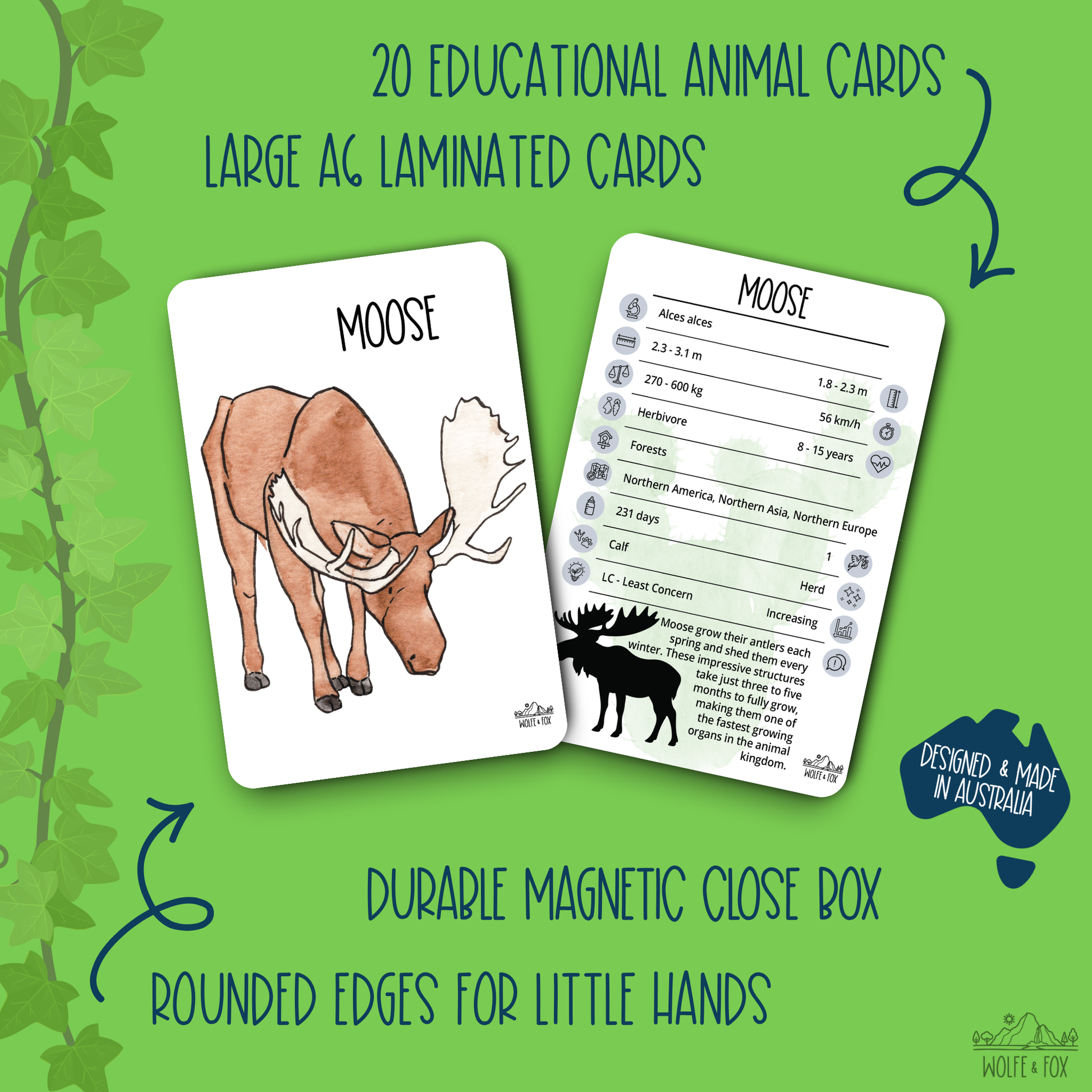 Intentionally designed in a large A6 format, the cards are perfectly sized for comfortable gripping by small hands, ensuring ample room for detailed facts and featuring rounded edges for safety. All 20 animal cards (plus the two instructional cards) are housed in a durable, navy blue magnetic close box, keeping your collection neat, secure, and ready for your next learning adventure!
