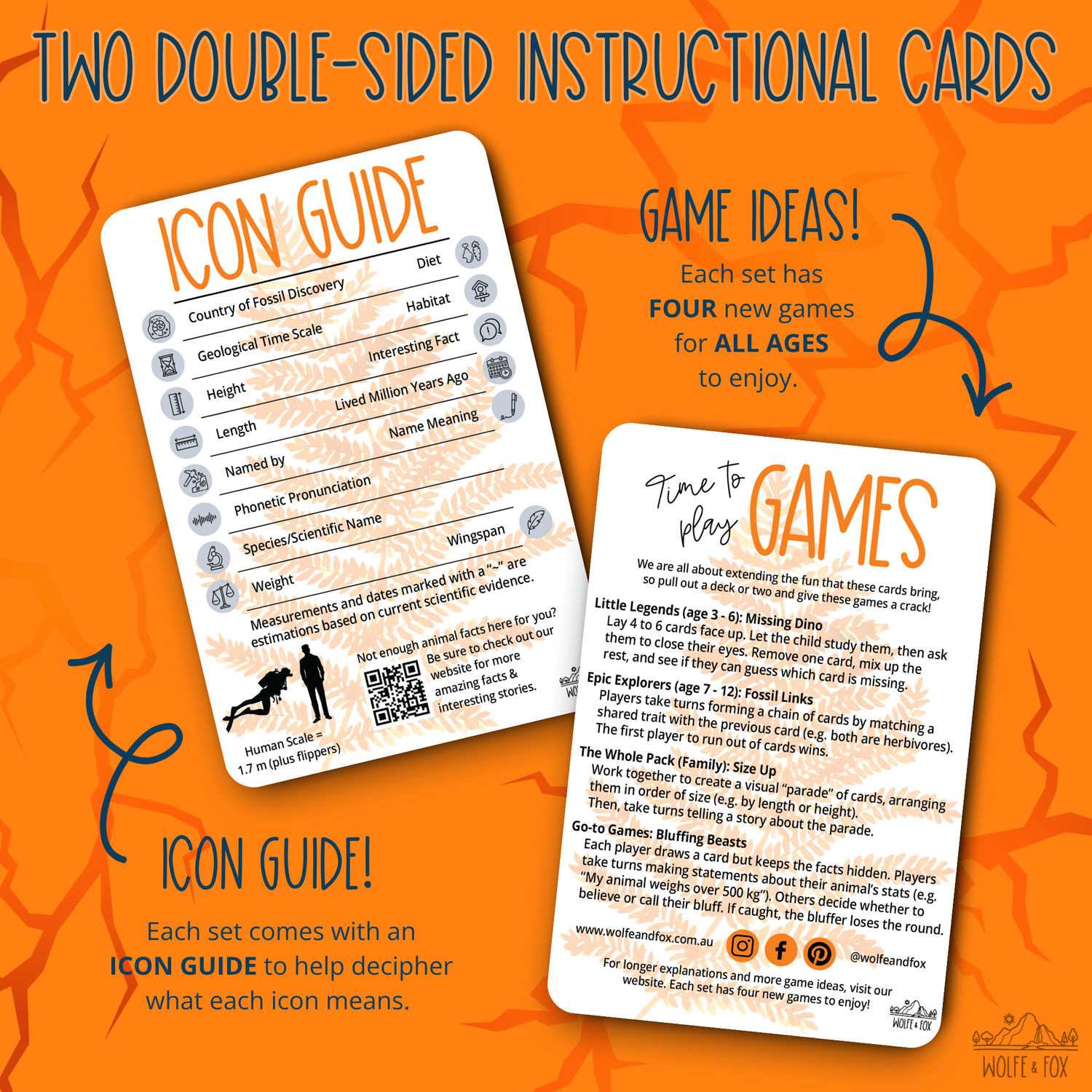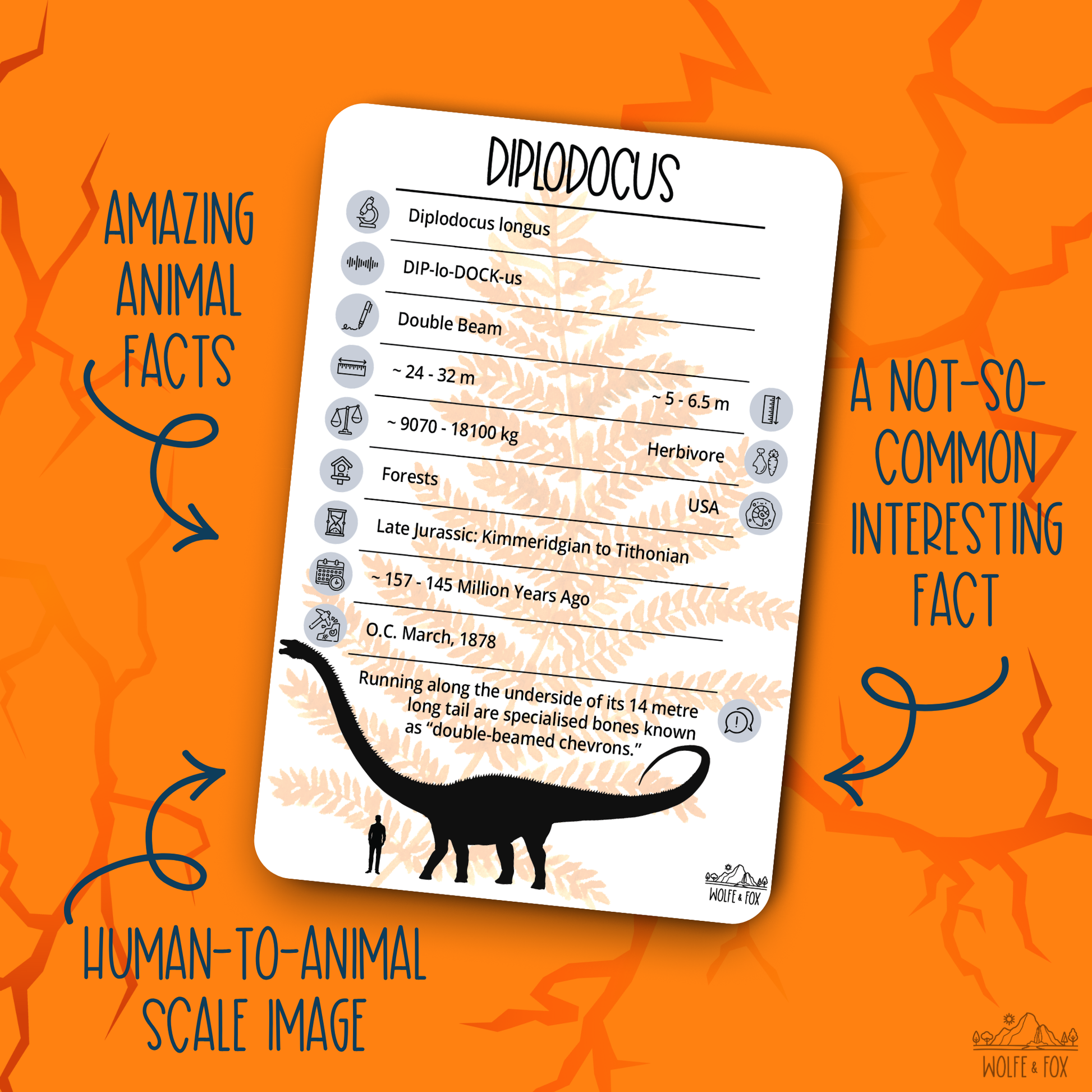 Get ready to unearth some astonishing facts! The back of every card is packed with information, featuring 12 accurate, engaging facts about each ancient creature. We love sparking discovery by including "not-so-common interesting facts," detailing unique biological features and discoveries - like how the Diplodocus had specialised bones, known as 'double-beamed chevrons,' running along its 14m long tail. Kids and parents especially love the unique Human-to-Animal scale image, which helps young minds truly visualise the massive difference between a small human and a 32m long Diplodocus. These are the perfect resource for school projects and connecting with the wonders of paleontology!