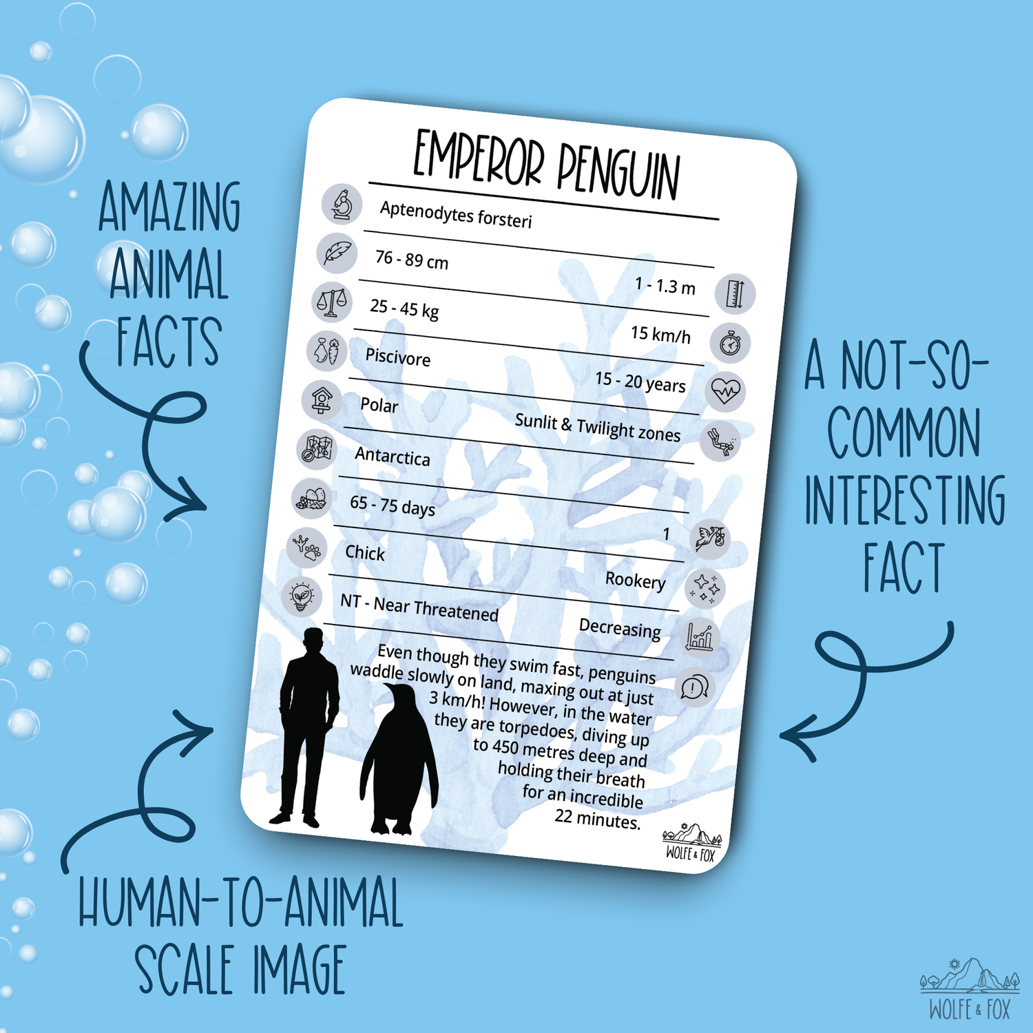 Ready to find the hidden gems of the coast? The back of every card is packed with information, featuring 16 accurate, engaging facts about each creature. We love sparking discovery by including "not-so-common interesting facts," providing details about nesting habits and migration patterns - like how the emperor penguin can dive up to 450 meters! Kids and parents especially love the human-to-animal scale image, which helps young minds truly visualise the massive difference between a small coastal bird and a giant humpback whale. These are the perfect resource for school projects and connecting with the incredible diversity found where land meets sea.