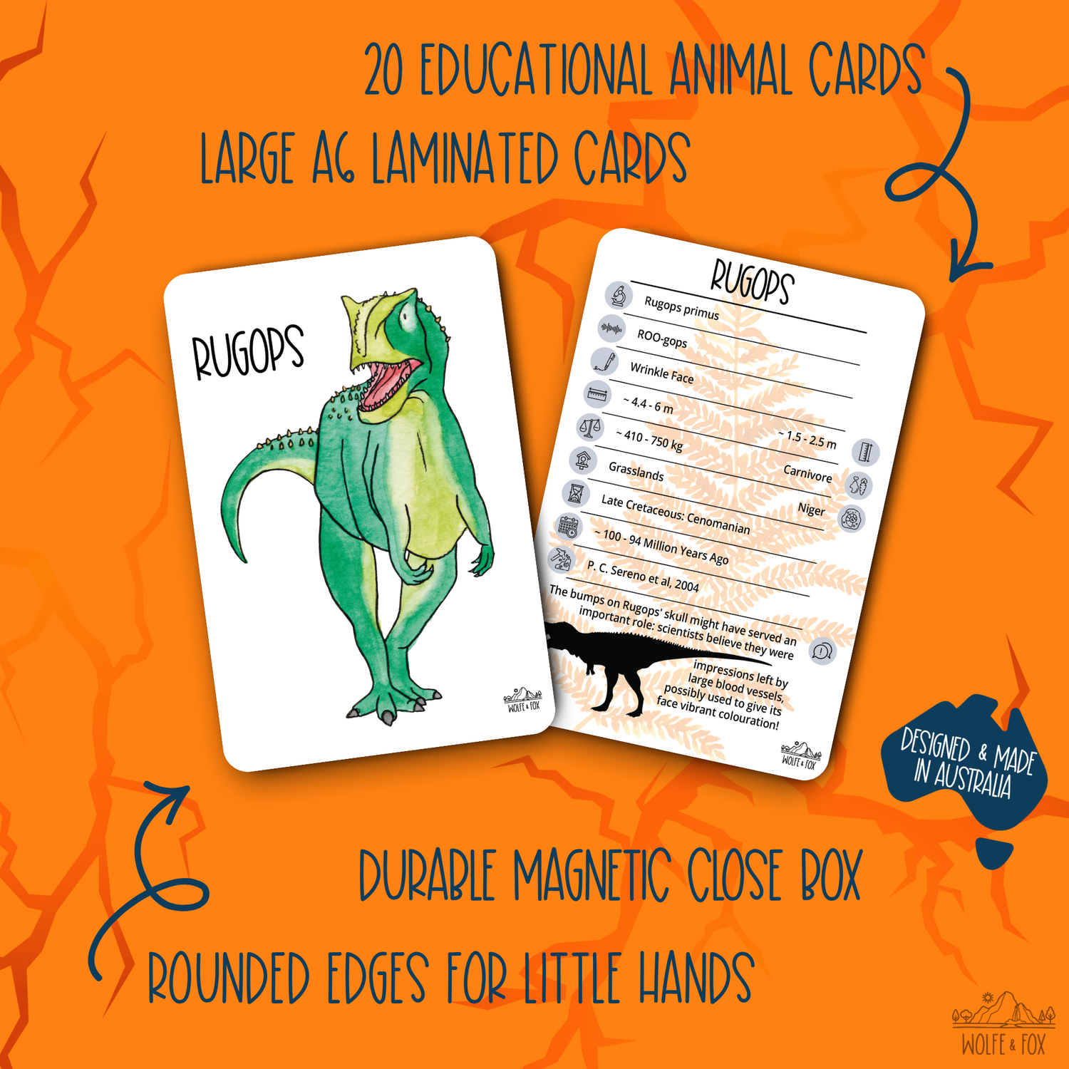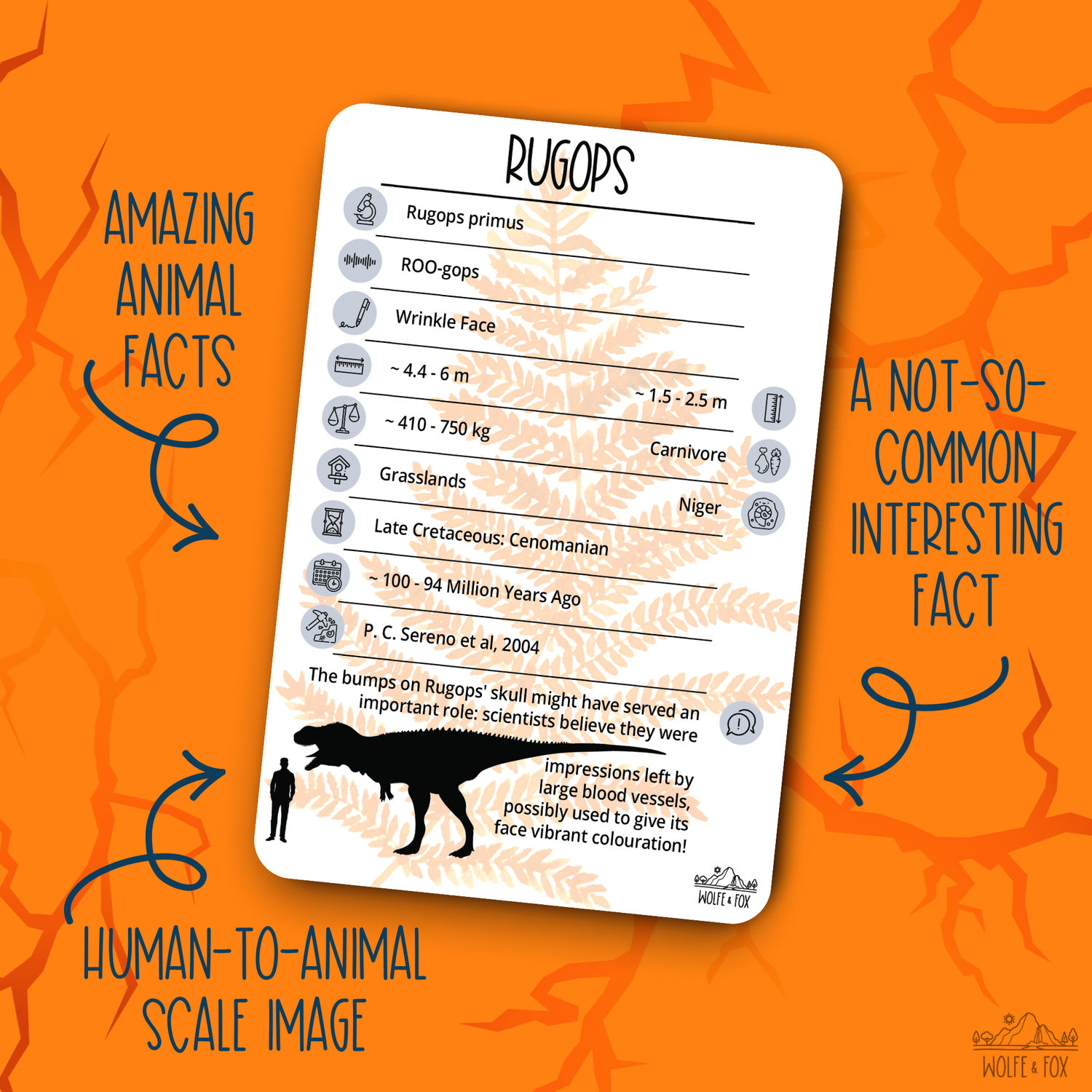 Ready to unearth some astonishing facts? The back of every card is packed with information, featuring 12 accurate, engaging facts about each ancient creature. We love sparking discovery by including "not-so-common interesting facts," detailing unique biology and discoveries - like how the bumps on the face of the fearsome Rugops might have served to give its face a vibrant colour. Kids and parents especially love the unique Human-to-Animal scale image, which helps young minds truly visualise the massive difference between a huge marine reptile, like Hydrotherosaurus, and a terrestrial beast, like Rugops. These are the perfect resource for school projects and connecting with the giants of ancient history!